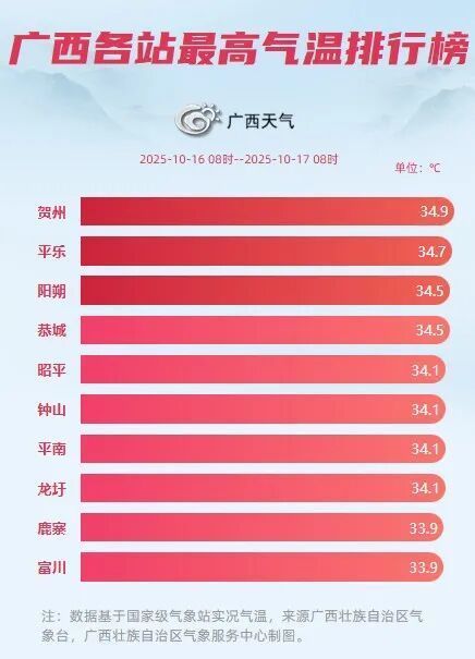 16日最高气温,除了桂西一些地方不足30℃以外,其余大部在30~34℃之间,其中贺州市以34.9℃获得榜首,百色市乐业县最高气温,只有25.4℃。